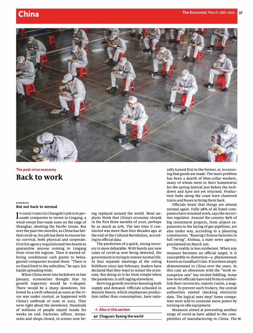The prediction of a quick, strong recovery is more debatable. With barely any new cases of covid-19 now being detected, the government is trying to restore normal life. At four separate meetings of the ruling Politburo since late February, leaders have declared that they want to restart the economy. But doing so is far from simple when the pandemic is still raging elsewhere.