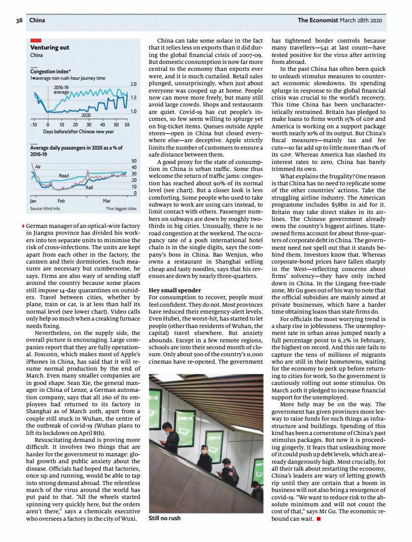 For consumption to recover, people must feel confident. Most provinces have reduced their emergency-alert levels. Even Hubei, the worst-hit, has started to let people (other than residents of Wuhan, the capital) travel elsewhere.