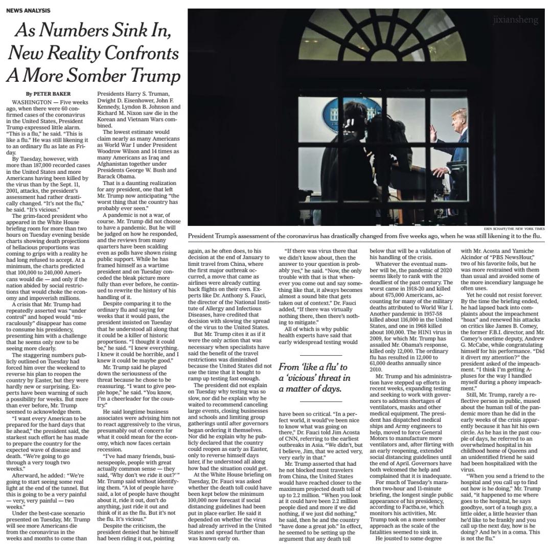 然而,截至周二,美國有超過18.7萬的病例記錄,死于該病毒的美國人比死于2001年9月11日襲擊的美國人還多,總統(tǒng)的評估結(jié)果發(fā)生了相當(dāng)大的變化。他說:“不是流感。”